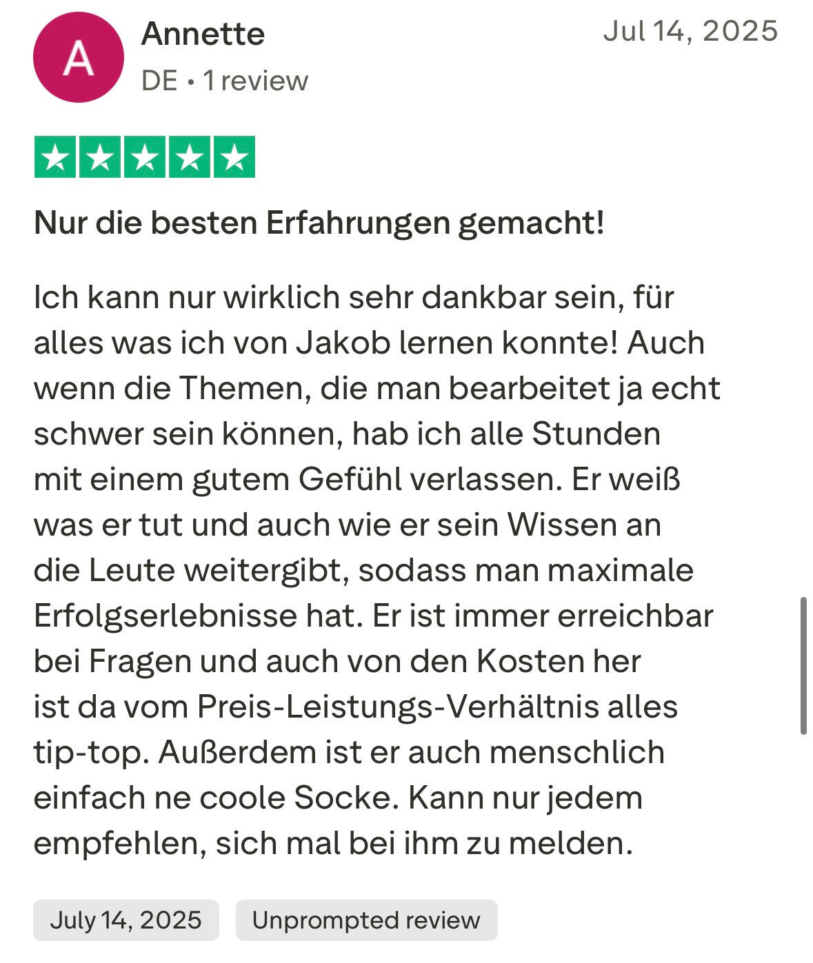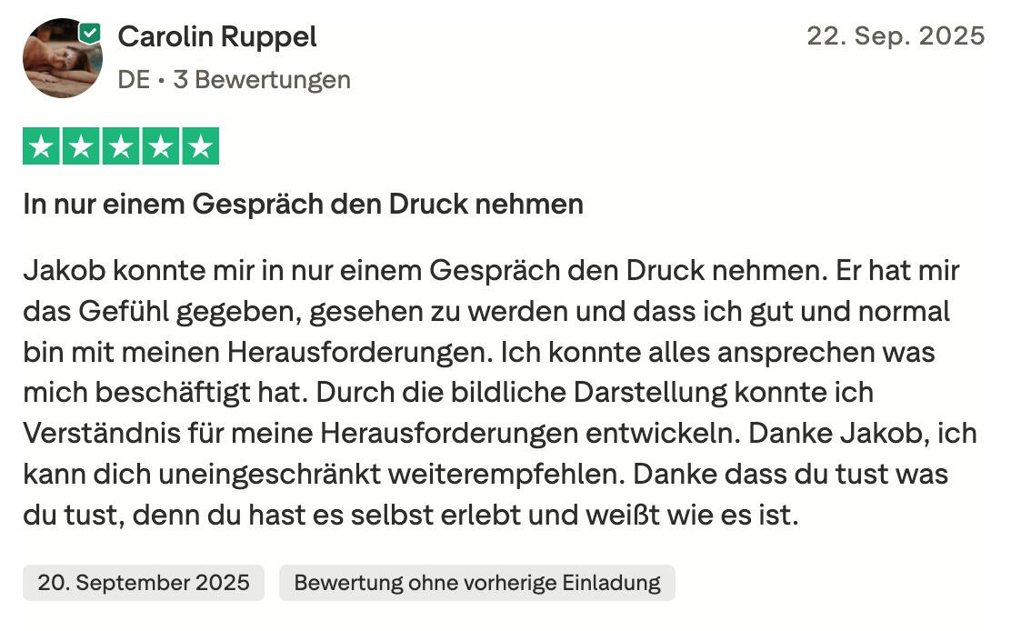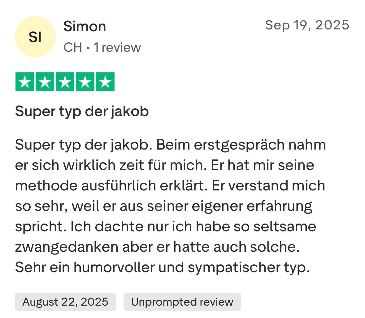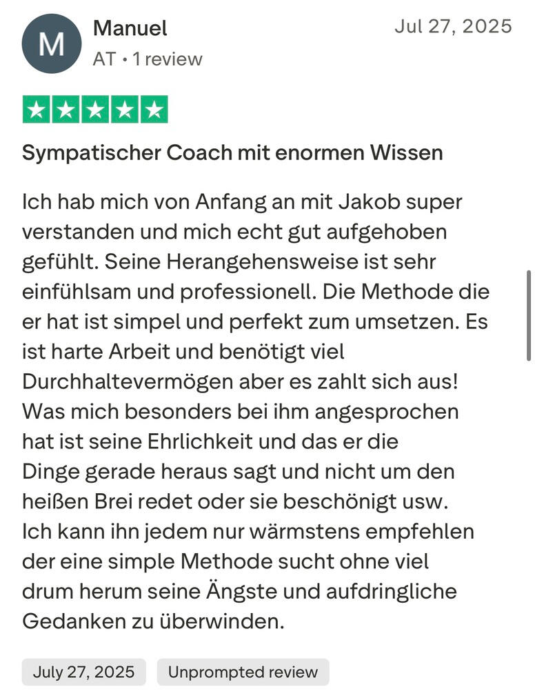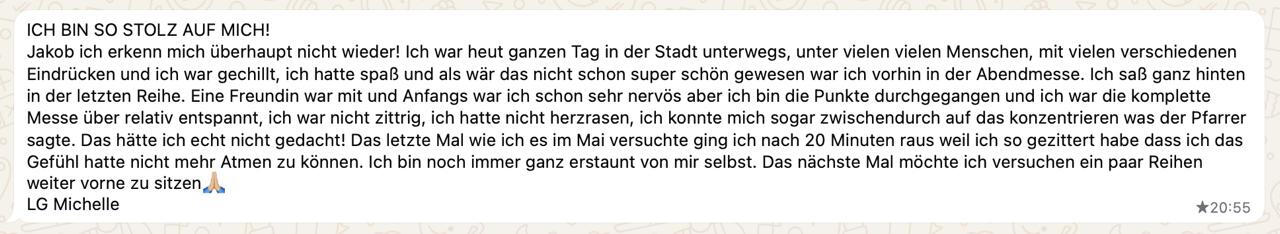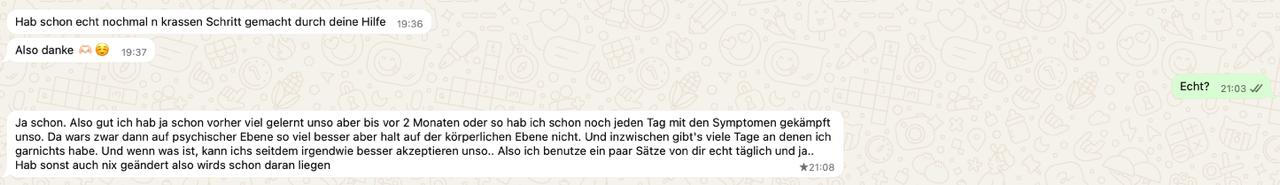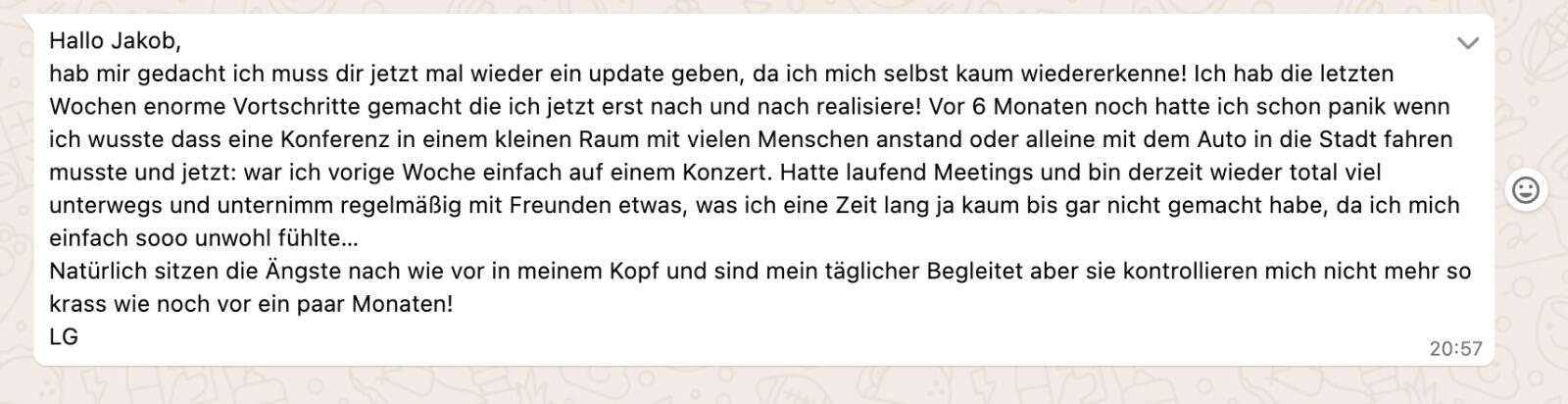Die Emotionen und die Angst werden noch eine ganze Weile anhalten und unangenehm sein. Das Nervensystem wird sein Warnsignal nicht so schnell aufgeben und immer wieder versuchen, dich zurück ins Grübeln, Vermeiden und Rückversichern zu bringen.Deine Aufgabe ist es, innerlich ruhig im Auge des Sturms zu bleiben. Mit der Zeit werden die Ängste nachlassen. Das ist aber nicht das Ziel. Wir wollen uns nicht sofort besser fühlen.Unser Ziel ist es, dem Nervensystem zu zeigen, dass seine Reaktion übertrieben ist. Als reiner Nebeneffekt werden die Ängste mit der Zeit immer weniger werden. Bei starken Ängsten wird die Angst noch 100-mal hochkommen. Das ist ganz normal.Wichtig ist nur, dass du immer und immer wieder das Zeichen an das Nervensystem sendest, dass du nicht in Gefahr bist. Und das machst du, indem du die Emotion da sein lässt. Kein Grübeln, kein Rückversichern, kein Ablenken. Hinsetzen und die Emotion da sein lassen, ohne das Ziel zu haben, sich sofort besser fühlen zu wollen. Es ist keine Technik, die man schnell mal anwendet. Du musst dich mit deinem ganzen Körper der Emotion ergeben. Wenn du es aus der Intention heraus machst, dich dadurch sofort besser fühlen zu wollen, wird das dein Nervensystem bemerken und keine Veränderung wird stattfinden.